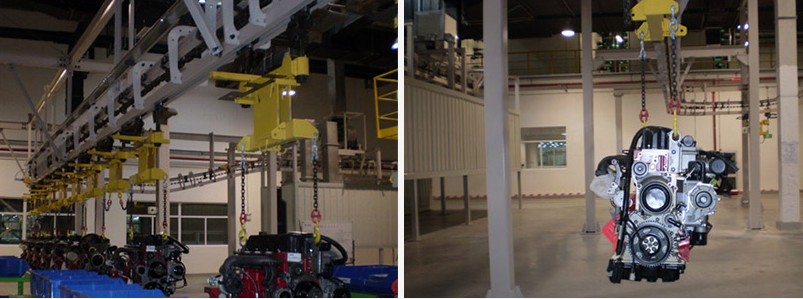 The project is an engine plant invested by Beiqi Foton Cummins, which mainly produces diesel engines. The integrated suspension conveyor system is used for continuous conveying and storage of workpieces. The system is divided into two parts. NO1 is responsible for transporting the two diesel engine assemblies to the hot test line. The system is driven by two variable frequency motor reducers to realize the mixing and unloading of the two engines. The air can be accumulated for 20 minutes. There are two belt lifts at the main assembly line, one for the 2.8L engine and the other for the 3.8L engine. There are two belt lifts at the hot test line, and the two engines are universal. NO2 transports the two diesel engine assemblies from the hot test line through the coating line to the accessory assembly. The system has six conveyor chains in the form of ground columns and aerial suspension. The functions of transportation, station operation, storage, station operation, cooling after drying and transportation are respectively completed. The system is equipped with four belt lifts for the upper and lower lines of the engine. The accumulative suspension conveyor control system accepts process information through industrial Ethernet, and transmits the system operation status and fault information to the host computer system transmitted via Ethernet. The system automatically reads the distinguishing information and signs of the two engines to achieve automatic differentiation. The function of the workpiece. The system reserves the PROFIBBUS interface of the RIFD to facilitate the expansion of the RIFD system in the future.