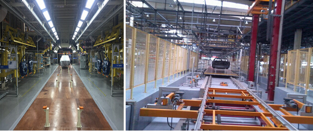 滑板式輸送機由滑板、摩擦驅(qū)動組成。主驅(qū)動利用摩擦驅(qū)動輪驅(qū)動滑板兩側(cè),該滑板靠此推力又將前面的滑板向前推送,這樣就形成連續(xù)輸送?;遢斔蜋C同時移動車身和進行裝配的操作工人,使工人在裝配工序的操作更加容易。