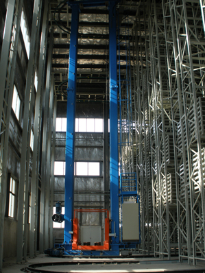 轉彎堆垛機由彎軌將兩個相鄰巷道聯(lián)通,與單深或者雙深位貨架配合,在出入庫效率較低的情況下可以減少堆垛機的數(shù)量,進而減少工程投資。