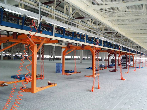 輸送系統(tǒng)包括:1、PBS系統(tǒng),采用摩擦式輸送系統(tǒng),用于漆后車身的輸送、存儲和排序;2、SUV內(nèi)飾裝配線采用CPC+空中摩擦輸送系統(tǒng),內(nèi)飾工藝鏈采用CPC,內(nèi)飾-底盤線及空抱具返回采用空中摩擦輸送;3、移載設(shè)備自動完成漆后車身從涂裝滑撬到PBS臺車及內(nèi)飾線的移載工作;4、PBS識別及控制系統(tǒng)采用現(xiàn)場總線,便于維護(hù)和系統(tǒng)調(diào)試。